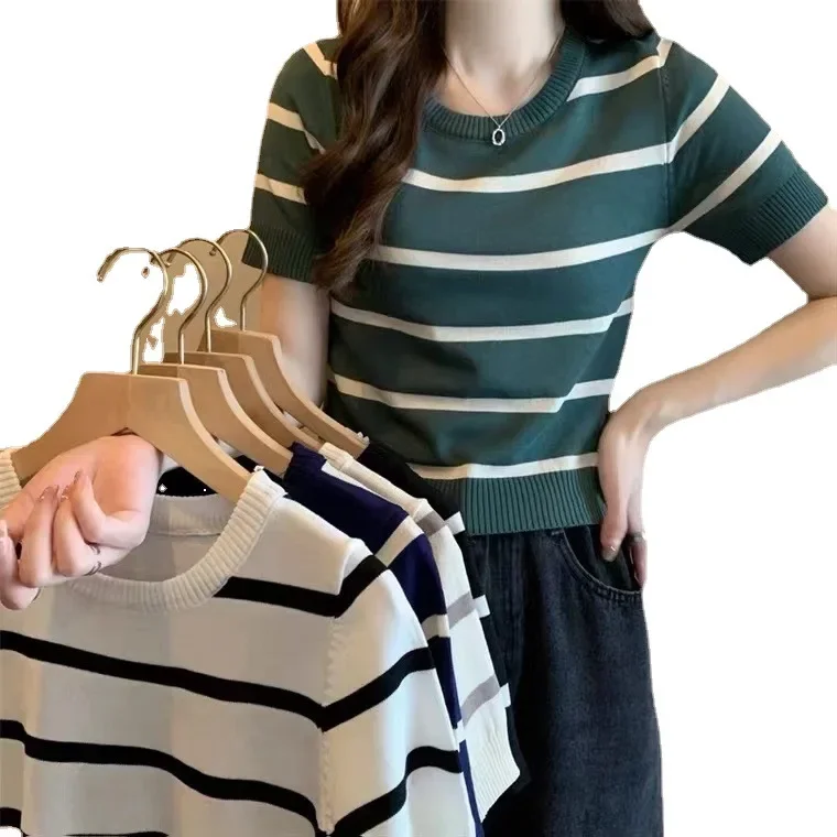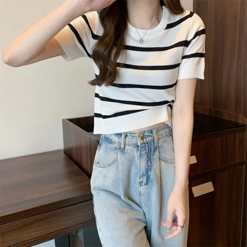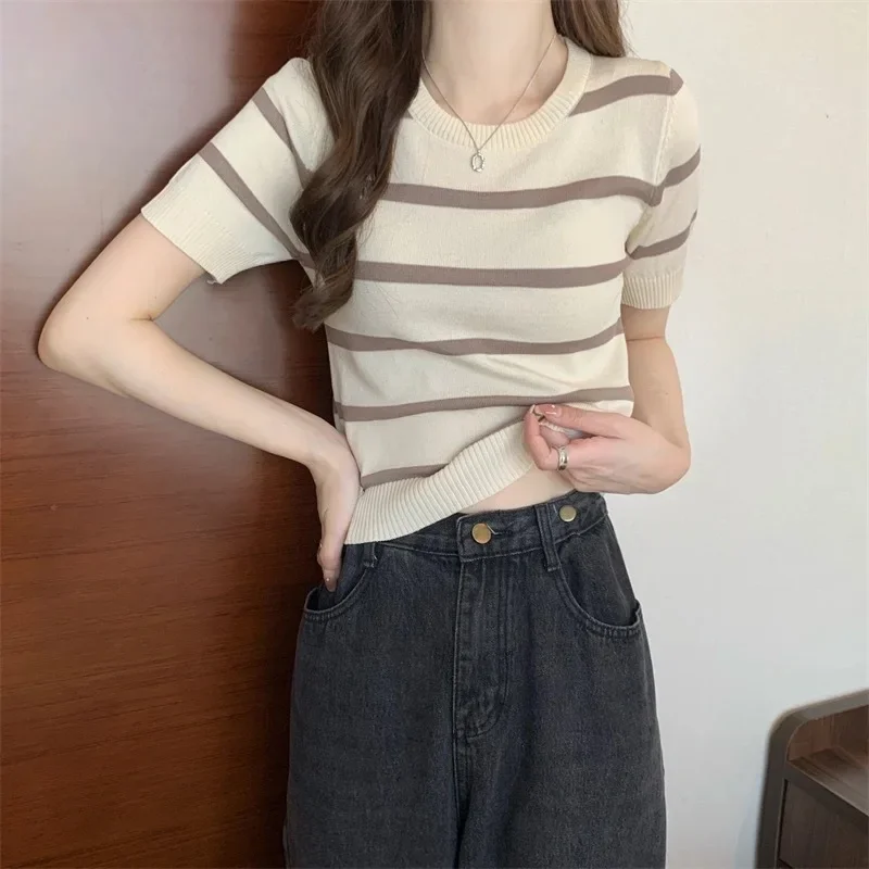 New Casual French Style Petite Summer Knitwear T-Shirt Women’s Slim Fit Cropped High-Waisted Top For Smooth Slimming Silhouette