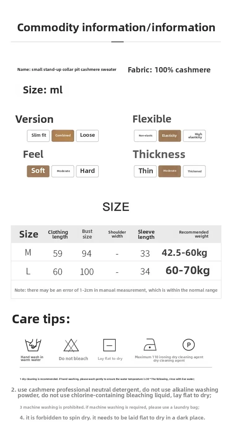 • Pure Cashmere Material : Crafted from pure cashmere, this sweater offers unparalleled softness and warmth, perfect for autumn and winter wear.